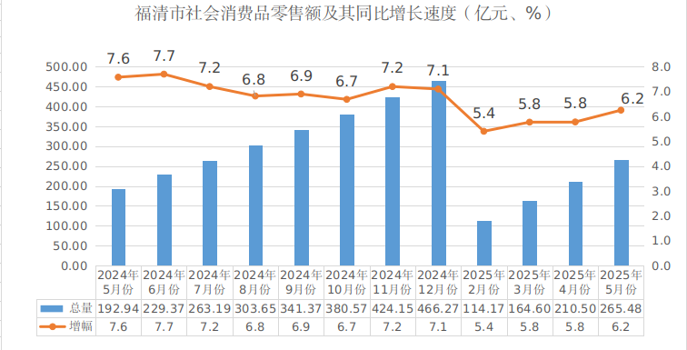 2025年5月福清市社会消费品零售额及其同比增长速度