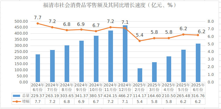 2025年6月份福清市社会消费品零售额及其同比增长速度
