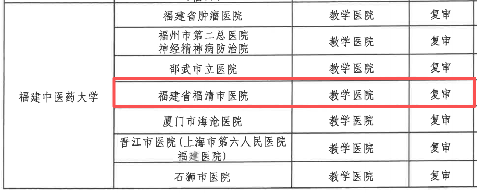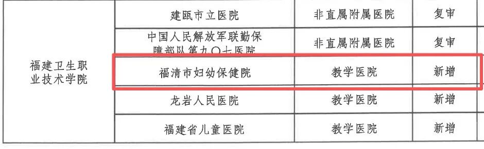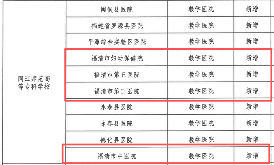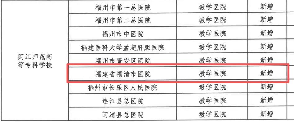 根据名单,福建省福清市医院通过复审,被福建中医药大学认定为教学医院,同时新增为闽江师范高等专科学校教学医院。福清市妇幼保健院新增为福建卫生职业技术学院和闽江师范高等专科学校教学医院。福清市第三医院、福清市第五医院、福清市中医院新增为闽江师范高等专科学校教学医院。