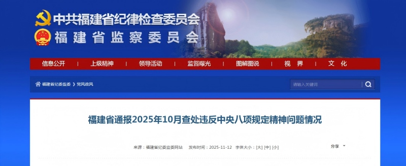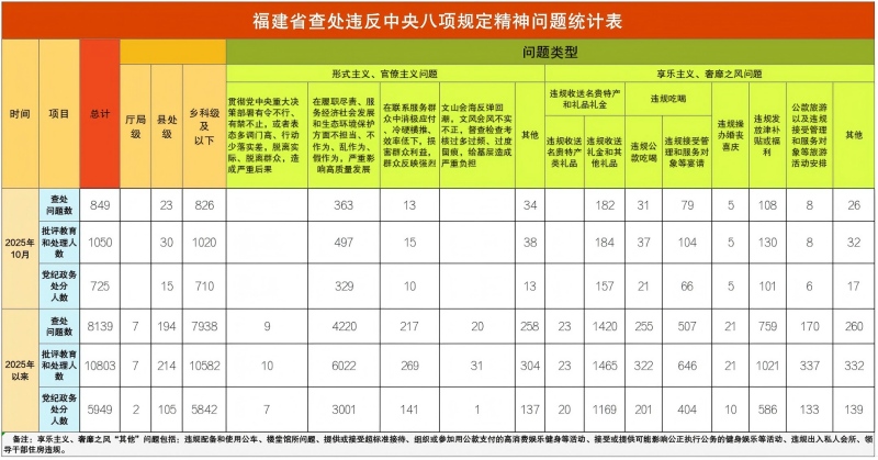 2025年10月,福建省查处违反中央八项规定精神问题849件,批评教育和处理1050人,给予党纪政务处分725人。福建省2025年以来查处违反中央八项规定精神情况如下: