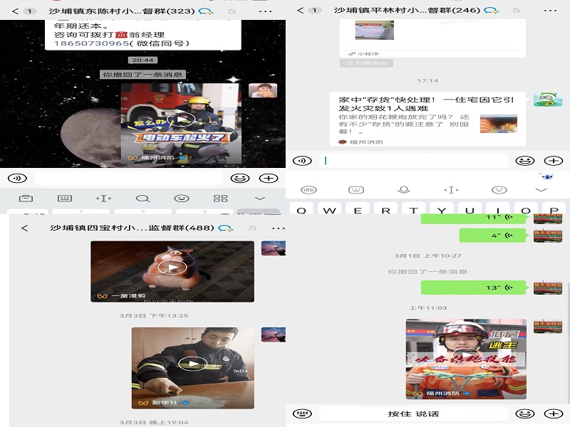 线上推送“知”消防。大队通过微信平台和短信,积极动员村居社区向居民发送预防火灾知识和消防安全提示,拓宽了广大群众学习掌握消防安全知识的途径,使广大群众在耳濡目染中提高自身的消防安全意识,营造出良好的消防安全宣传氛围。