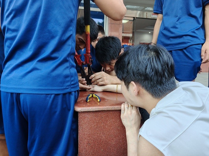 队站值勤干部经过一番查看后发现:该男子右手食指被戒指卡住,已经明显肿胀,如果不尽快取下戒指,会导致更加严重的情况发生。了解情况后,队员立即展开处置,先将两根牙签插进戒指与手指中间,使戒指与手指形成一定的空间防止剪切时候造成二次伤害,然后用工具对戒指进行剪切。经过队员的努力,成功将戒指剪断取下。
