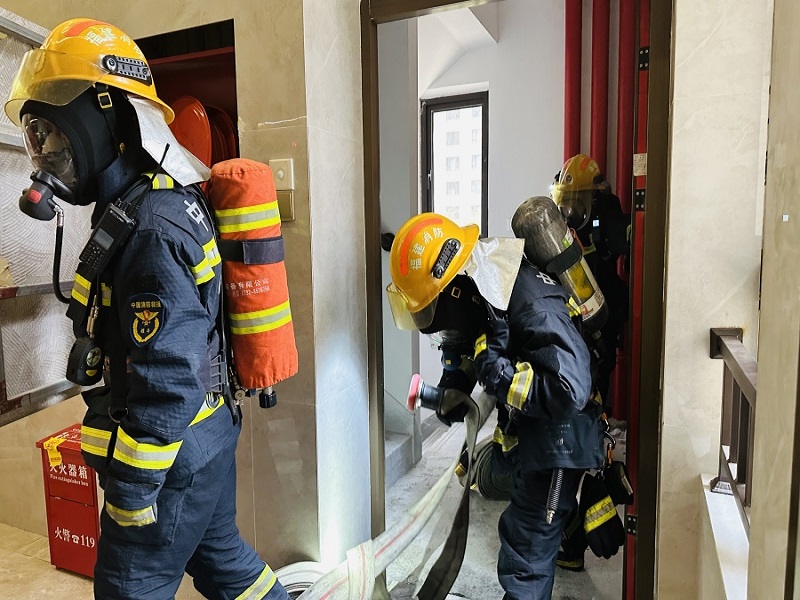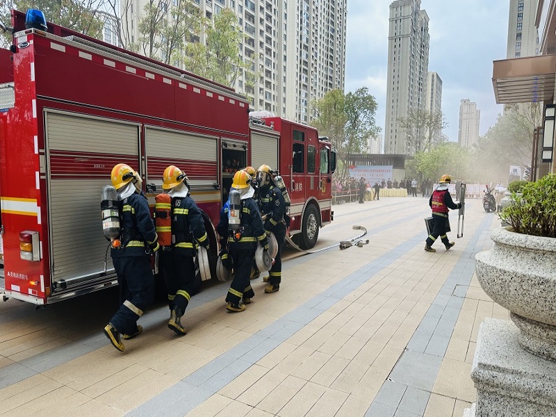 在高层火灾扑救环节,演练模拟小区监控中心接到消防主机报警,11号楼3层301室户内烟感报警,监控值班人员通知巡逻人员到达现场查看,确认火情后立马上报,并拨打报警电话。小区微型消防站义务消防员迅速出动,利用楼道内的消火栓进行初期火灾扑救,他们熟练地展开水带、连接水枪、打开阀门,对准火源根部喷射,有效控制火势蔓延。福清消防救援大队接到报警后,迅速调派消防车赶赴现场。消防员到达后,立即展开救援行动,利用消防车对高层被烧楼层进行灭火扑救。同时利用消防车的大功率水枪对火势进行压制,在各方的紧密配合下,大火最终成功扑灭,被困人员全部安全获救。