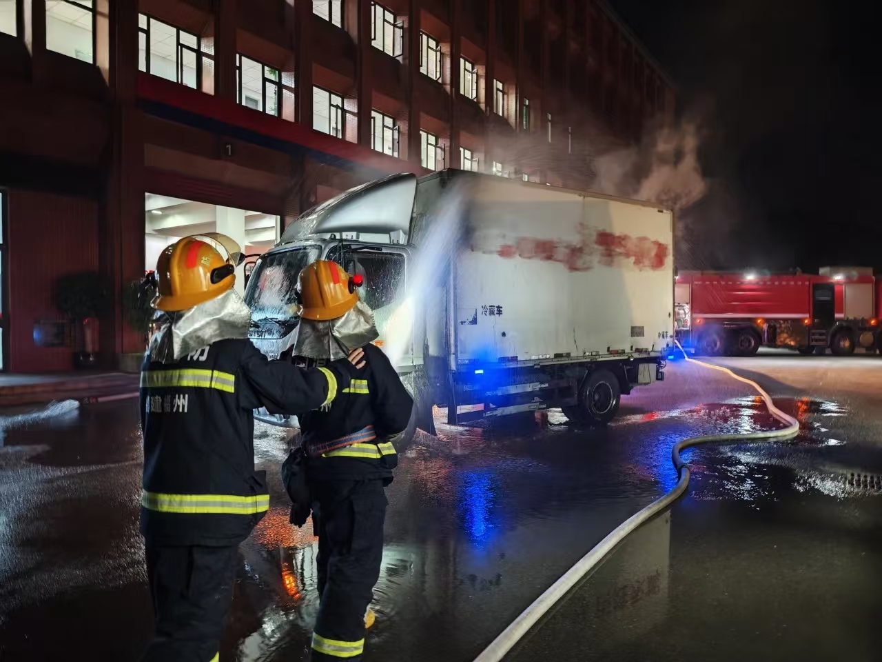 22时26分,全体指战员到达营区,经过现场侦查,结果更让人揪心:该货车车厢为保温结构,内部泡沫夹层已被高温烘烤至持续燃烧,浓密黑烟在密闭空间内快速积聚,随时可能引发轰燃,一旦火势突破车厢,后果不堪设想。指挥员当机立断,迅速划定警戒区域,下达“先控制后消灭、分段处置”的作战指令:一组指战员手持水枪,瞄准火源核心部位强力喷射,密集水流瞬间压制住制冷器压缩机及车厢外部明火,有效阻止火势进一步扩散;另一组指战员则在水枪掩护下,手持破拆工具果断撕开车厢保温层,将内部燃烧的泡沫材料“连根清除”,彻底切断火势蔓延路径。为防止“复燃隐患”,指战员后续还携带热成像仪对车厢内部进行全面排查,对每一处疑似阴燃点反复浇水降温,直至热成像仪显示所有区域温度恢复正常,22时45分,现场明火已扑灭,车辆温度降至正常,确认无安全隐患。