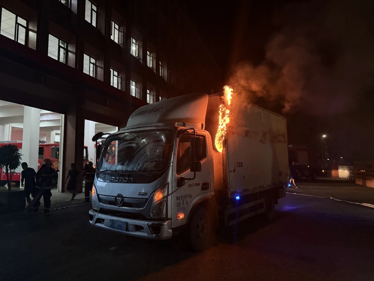 10月9日22时25分,镜洋站正处于夜间备勤时段,营区岗哨执勤人员突然发现一辆货运车辆“冒火疾驰”,车身裹挟着滚滚黑烟从营区大门方向冲来,车顶火光跳动明显,驾驶员半个身子探出车窗,高声呼喊“着火了!快帮忙!”。