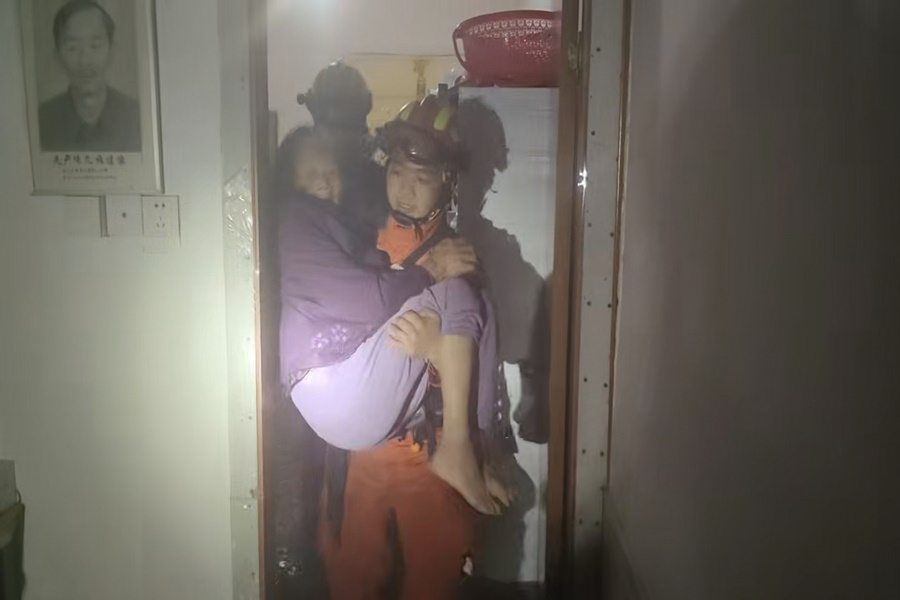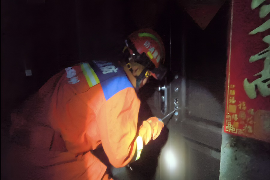救援途中,救援人员与报警人实时沟通了解到被困者是一位93岁的老奶奶独自居住在居民楼一楼。据悉,当日傍晚起海口镇开始持续降雨22时至23时雨势达到最强随着降雨不断持续现场水位逐渐上涨因老奶奶行动不便无法自行下床开门最终被困屋内。消防救援人员抵达现场后经侦察发现现场积水最深处已涨至膝盖处,此时老奶奶的女儿也已赶到家中然而令人着急的是老奶奶家的防盗门从内部反锁即便有钥匙也无法打开,为尽快将老奶奶转移至安全区域,救援人员当机立断,对反锁的门锁进行破拆,破拆完成后救援人员进入屋内万幸的是老奶奶意识清醒并无生命危险救援人员小心翼翼地以公主抱的方式全程悉心保护着老奶奶经过近10分钟的努力成功将老奶奶转移至楼上安全区域并交由其女儿照顾。