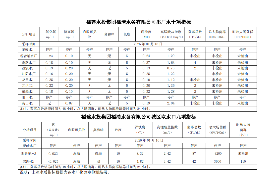 2026年01月16日供水水质信息发布