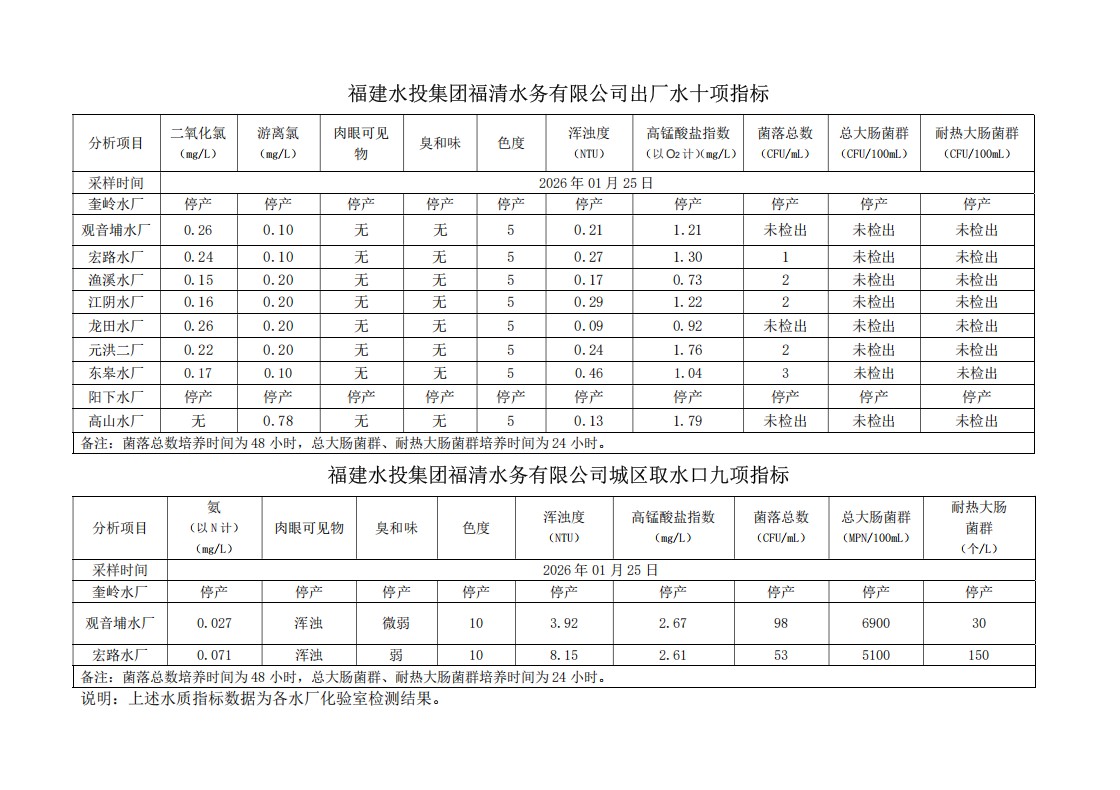 2026年01月25日供水水质信息发布