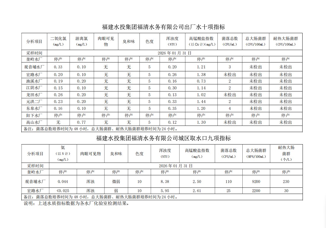 2026年01月31日供水水质信息发布
