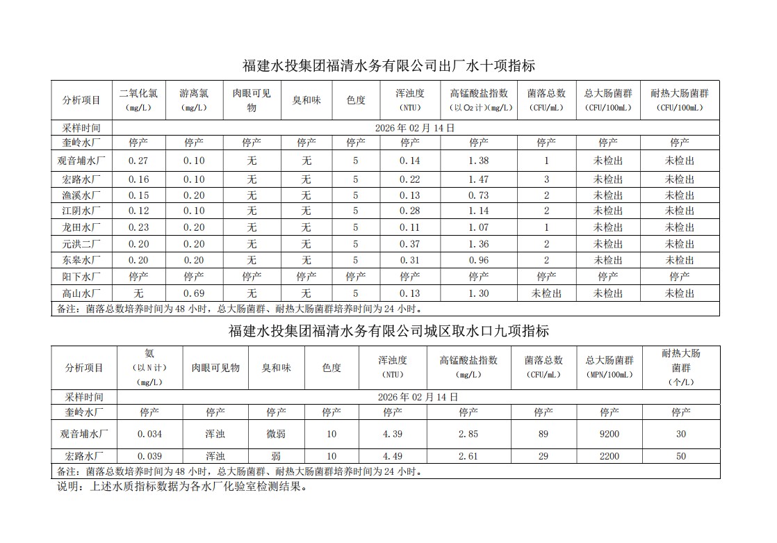 2026年02月14日供水水质信息发布