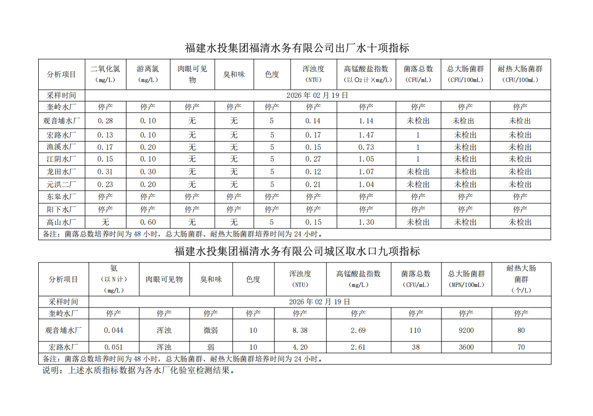 2026年02月19日供水水质信息发布