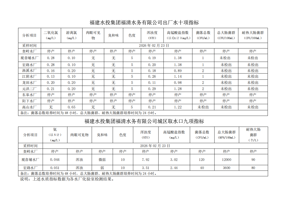 2026年02月23日供水水质信息发布