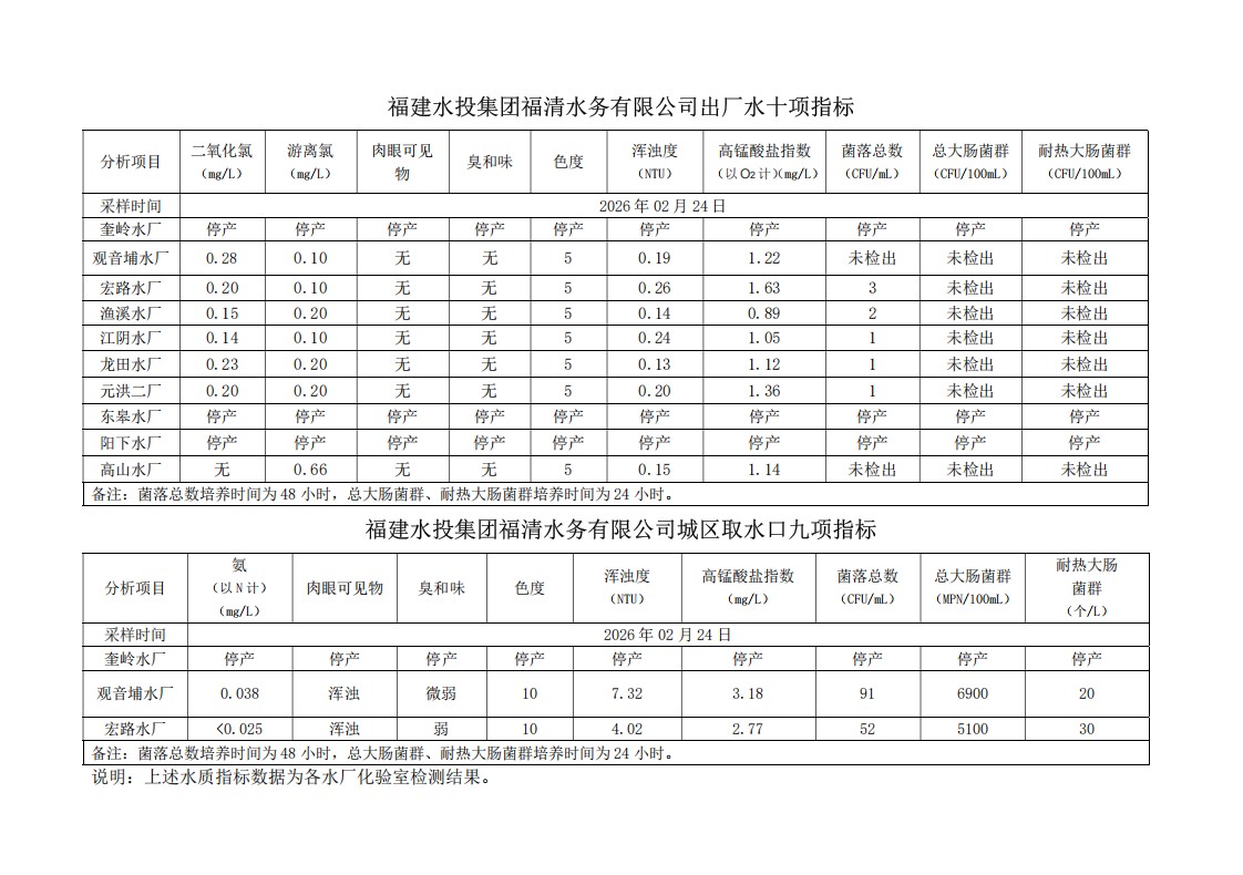 2026年02月24日供水水质信息发布