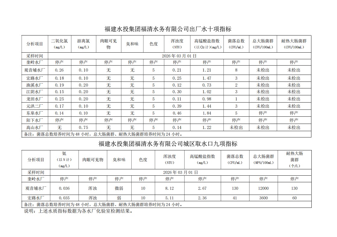 2026年03月01日供水水质信息发布
