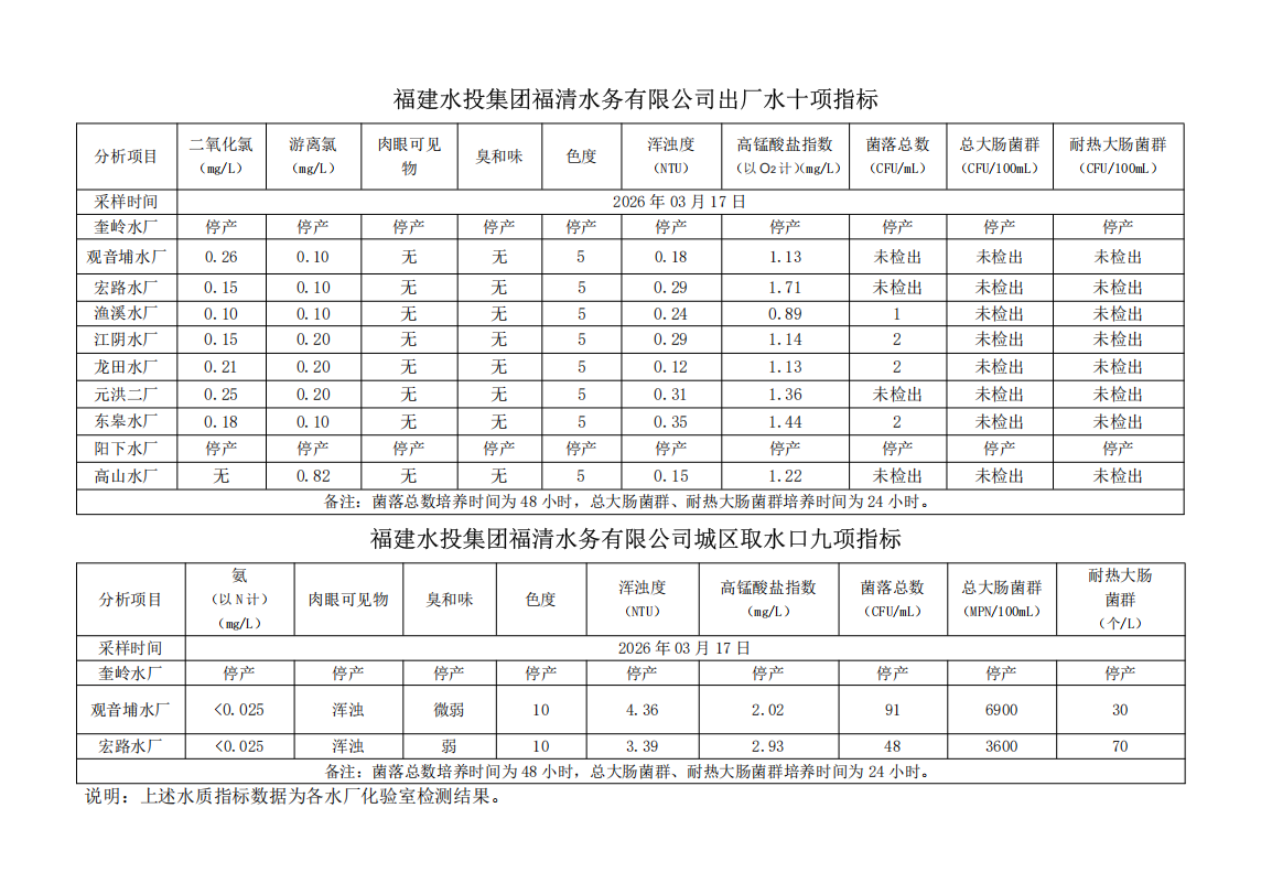 2026年03月17日供水水质信息发布