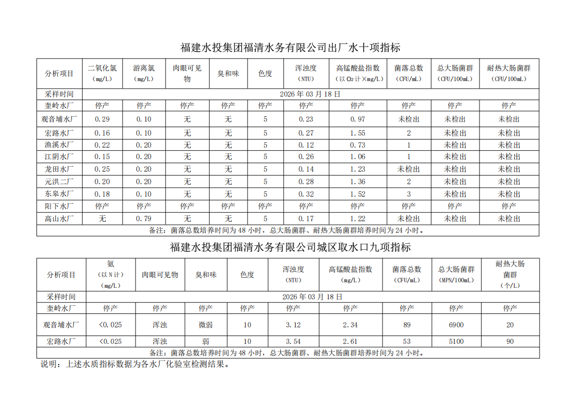 2026年03月18日供水水质信息发布