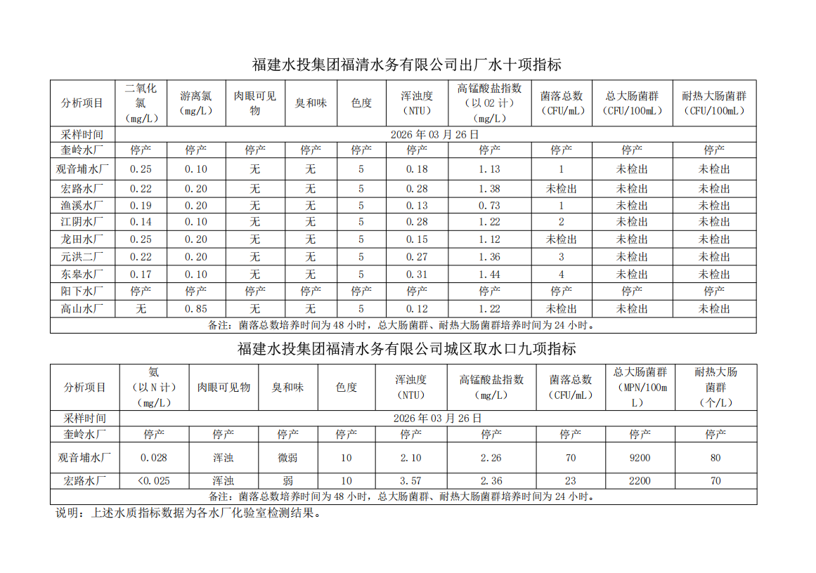 2026年03月26日供水水质信息发布