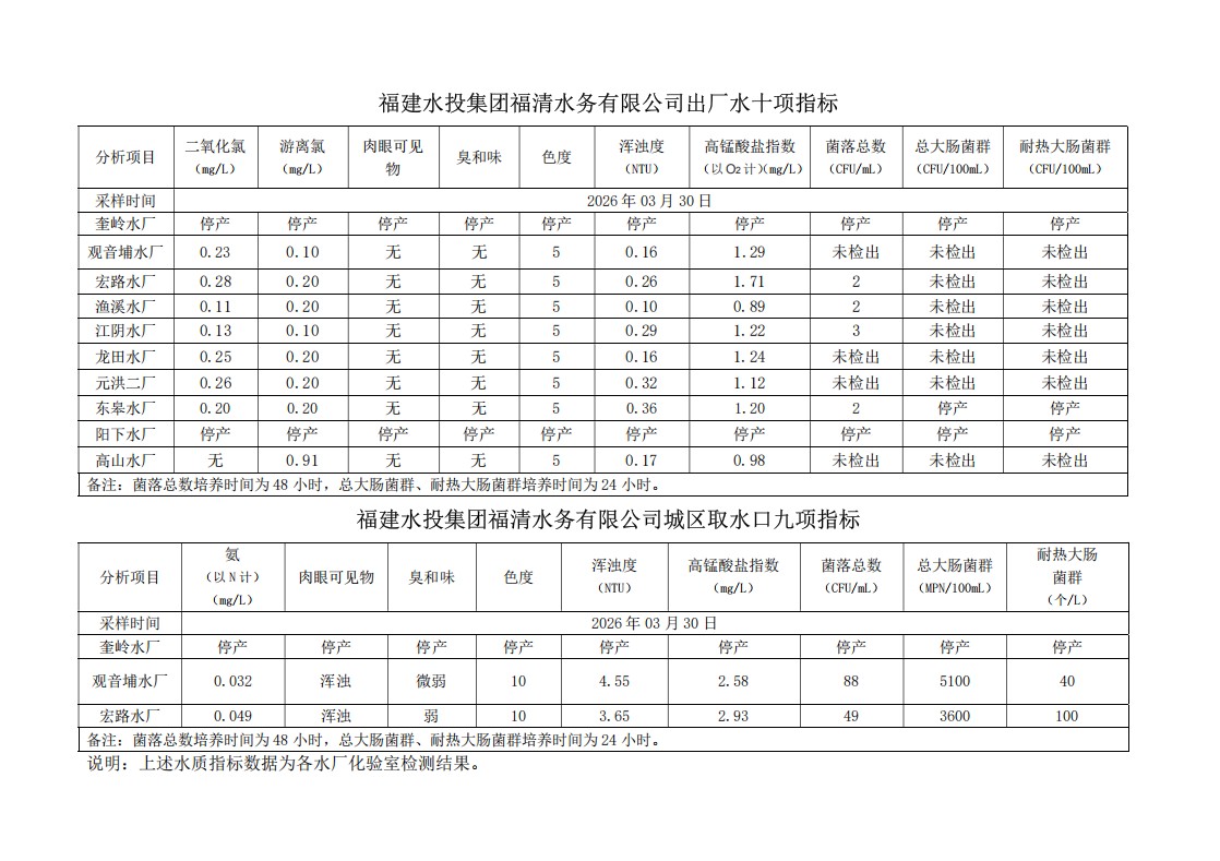 2026年03月30日供水水质信息发布