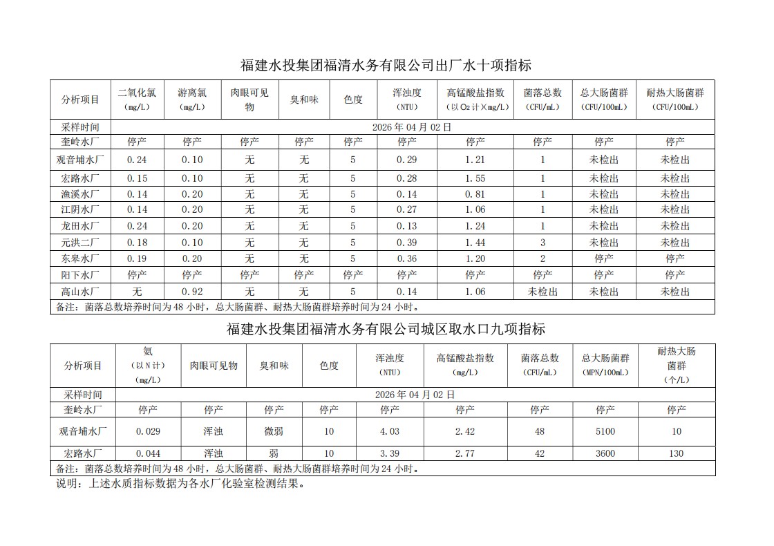 2026年04月02日供水水质信息发布