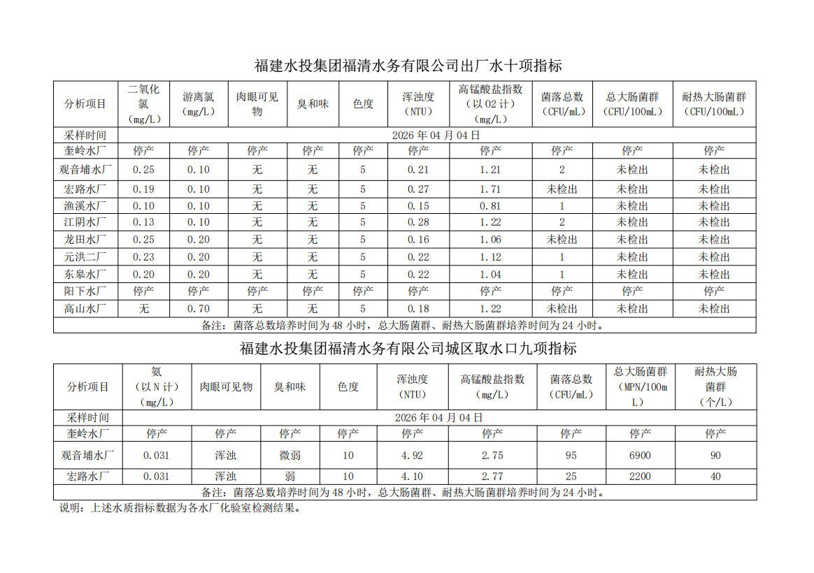 2026年04月04日供水水质信息发布