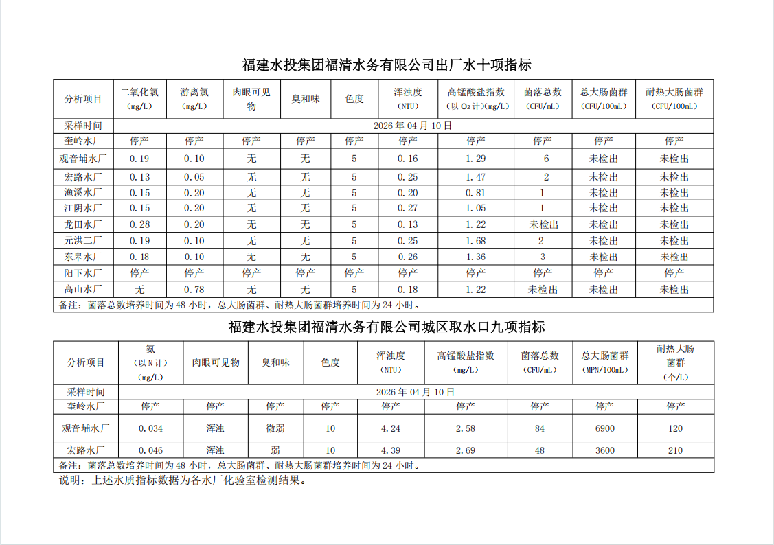 2026年04月10日供水水质信息发布