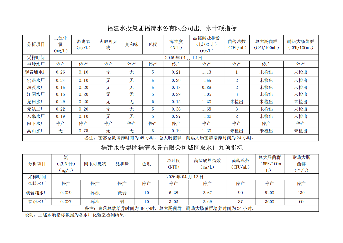 2026年04月12日供水水质信息发布